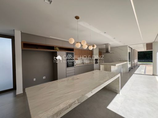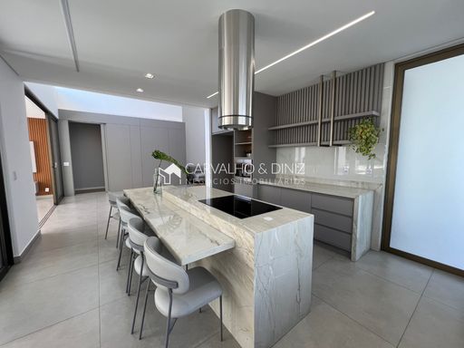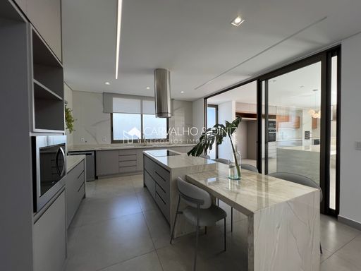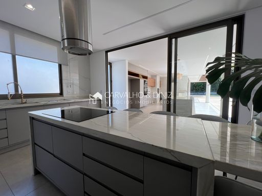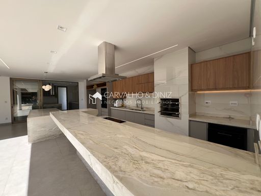 Cozinha e gourmet de alto padrão: Cozinha equipada com ilha central e eletrodomésticos modernos. Espaço gourmet completo, com bancada em granito Mont Blanc, churrasqueira, forno, armários e disposição para fechamento em vidro.