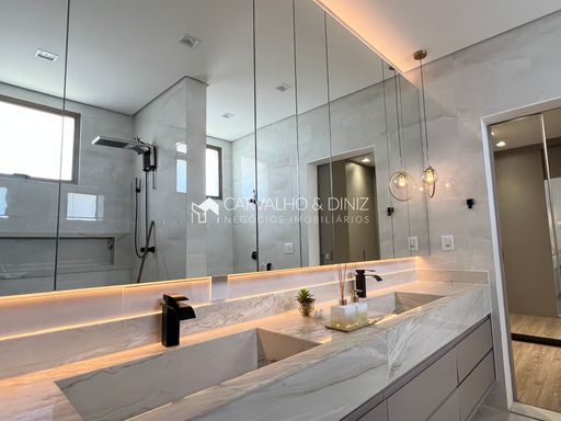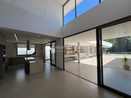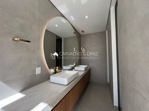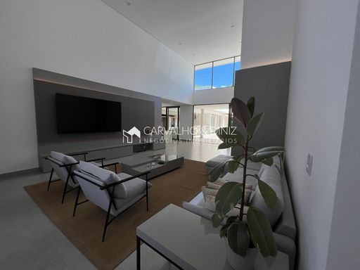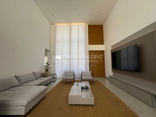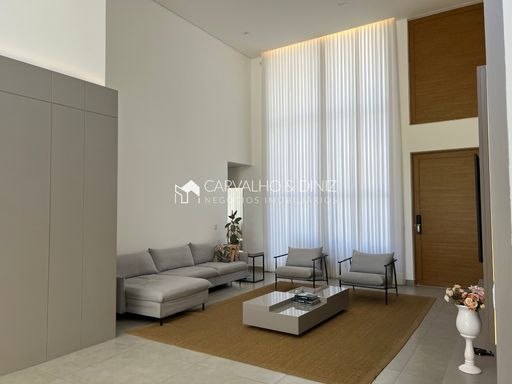 Área social integrada: Sala ampla com pé-direito duplo, iluminação planejada e integração com a cozinha e o espaço gourmet, garantindo praticidade e sofisticação no dia a dia.